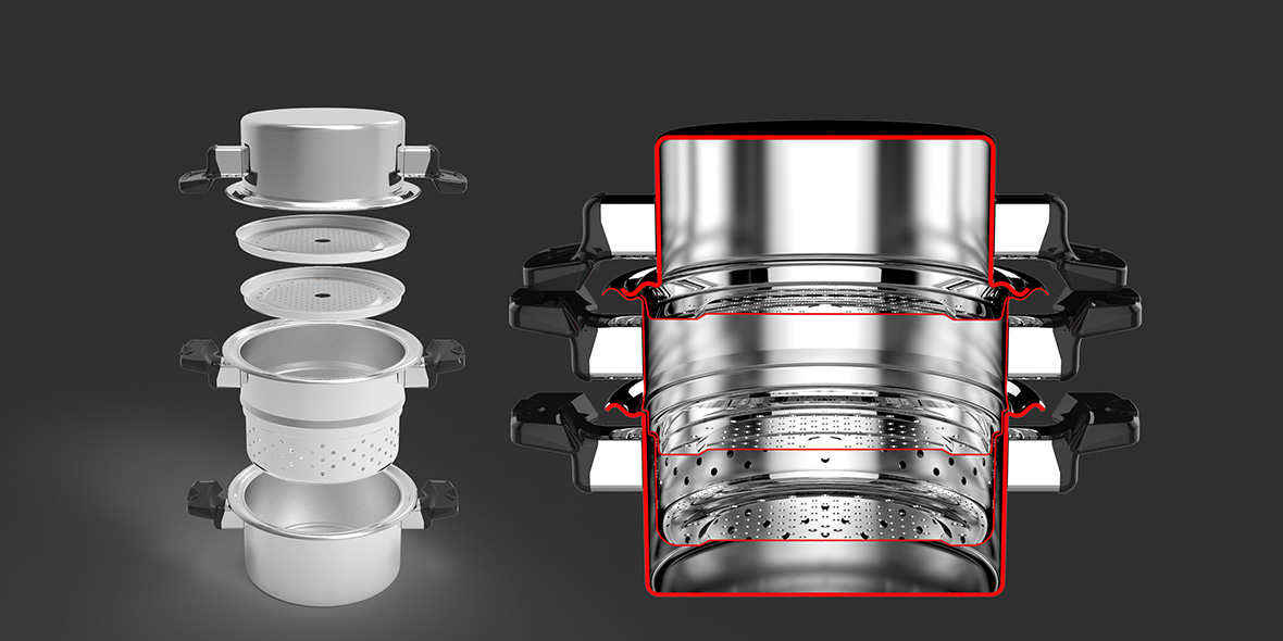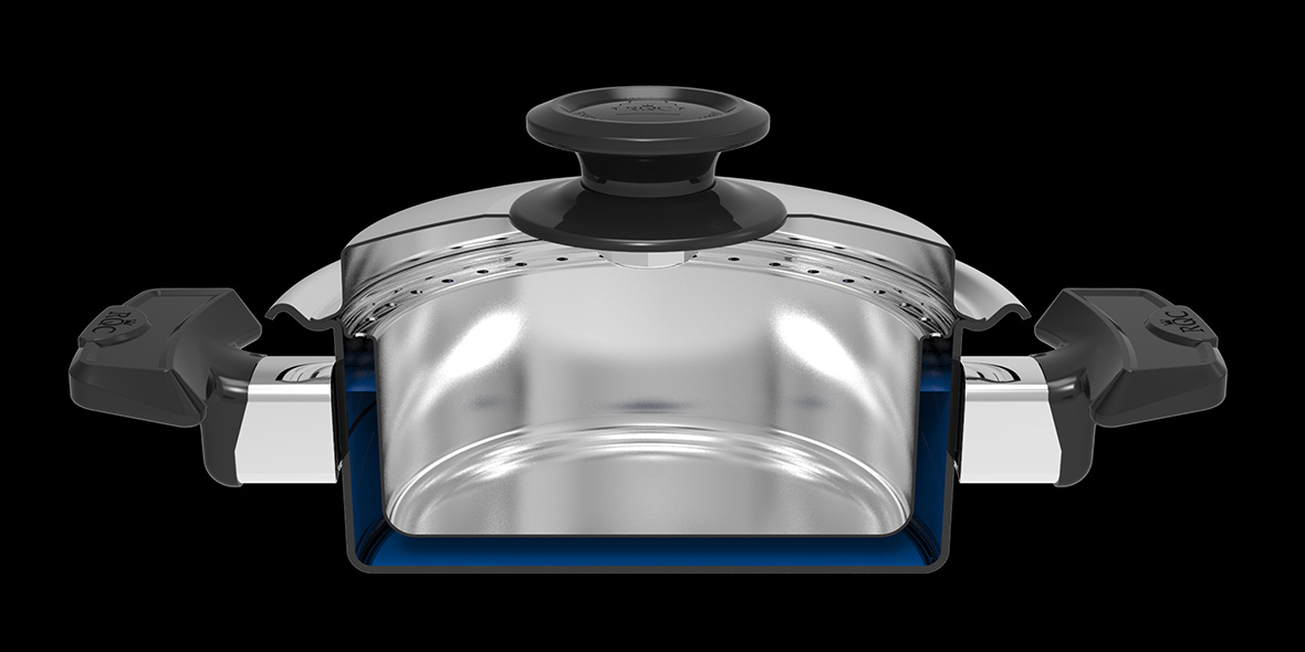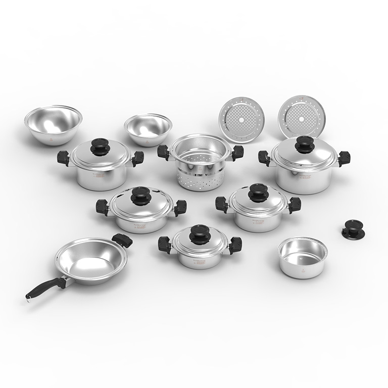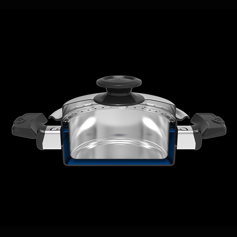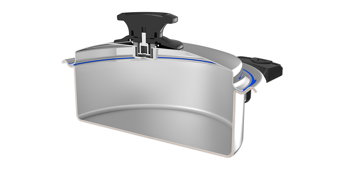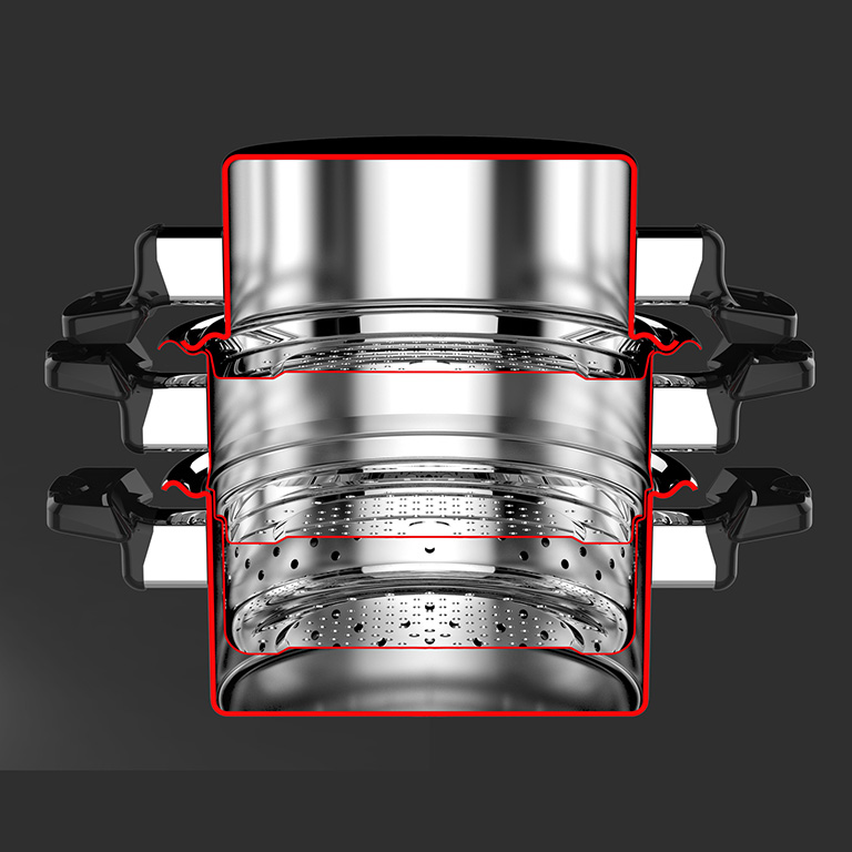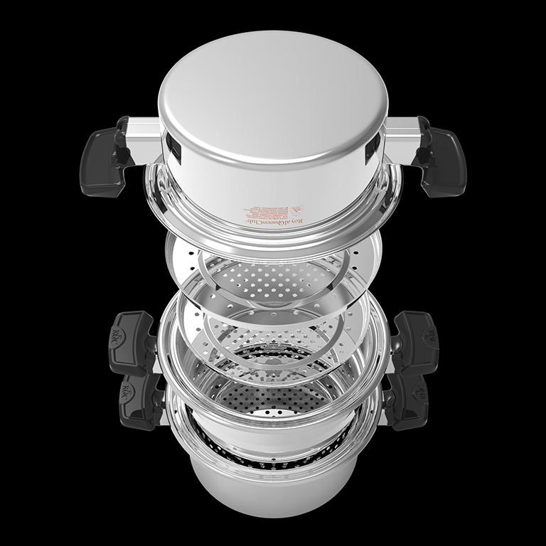 정밀가공된 본체와 뚜껑의 결합부에는 완벽한 수막이 형성되어 맛과 영양의 손실을 최소화합니다. 놀랍게도 뚜껑으로 쓰인 1.9Kg 무게의 24CM 소테팬이 팽이처럼 가볍게 회전합니다.