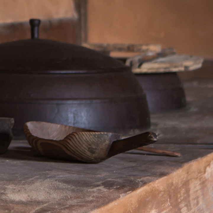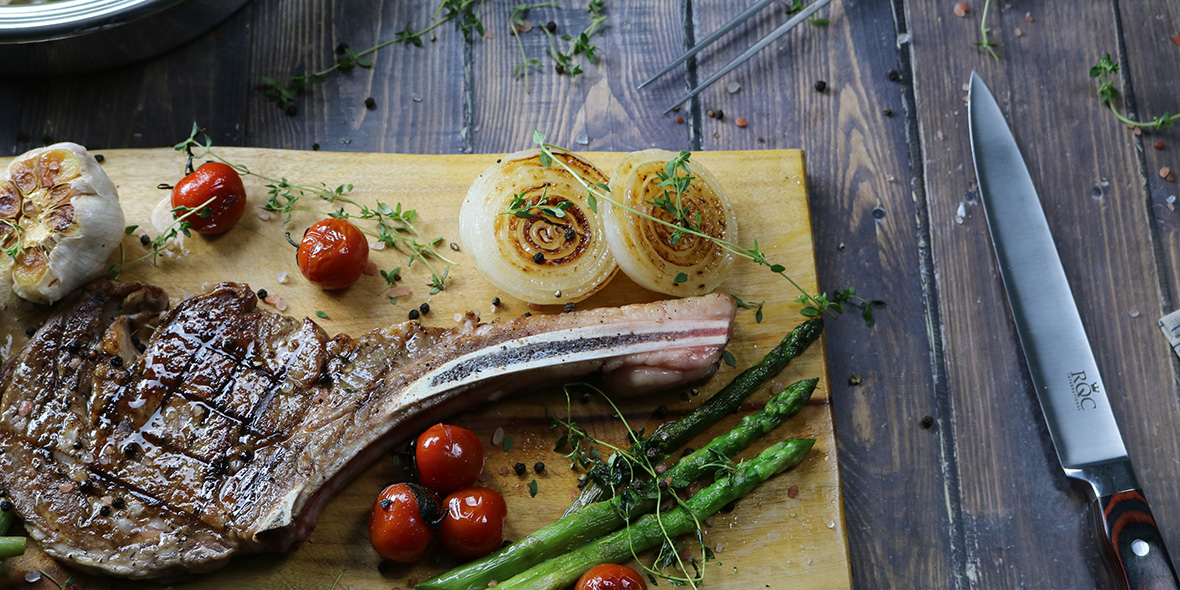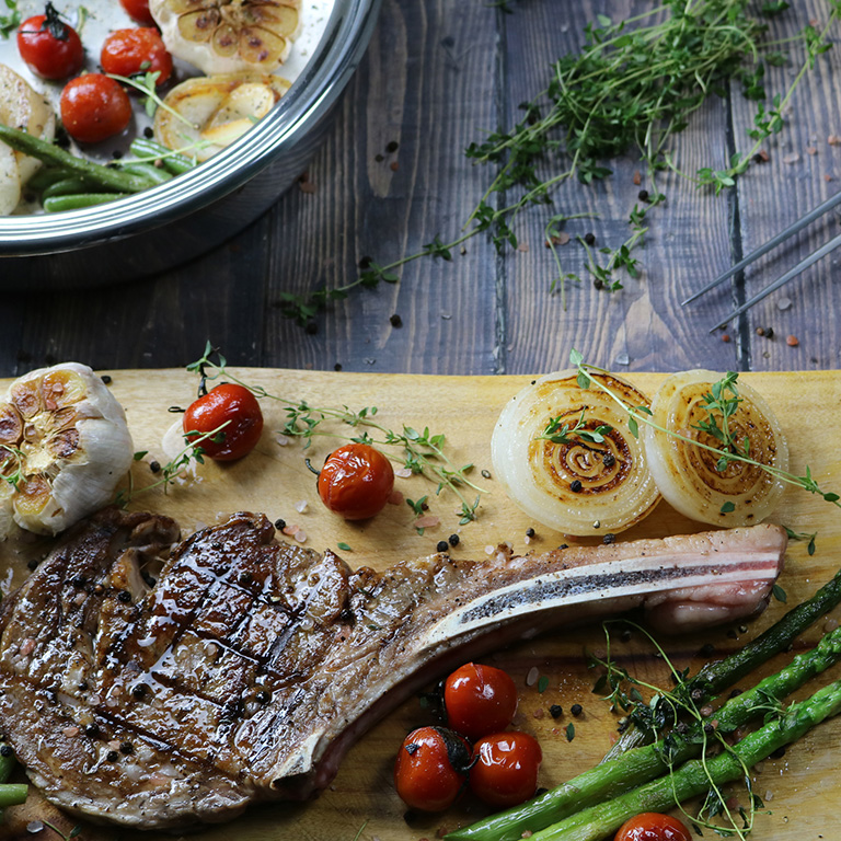 넓은 바닥면적에 골고루 열이 퍼지고 보존되어 예열과 잔열의 효능을 높이도록 재질을 선정하였습니다. 재료를 스킬렛 위에 올려놓을 때의 급격한 열 손실이 적고 본래의 온도로 환원되는 시간이 짧아 스테이크 요리에 최적입니다. 재료를 시어링하여 마이야르 반응이 완성되면, 화구의 화력을 낮추고 뚜껑을 덮어 낮은 열로 재료의 내부를 원하는 정도까지 익힐 수 있습니다. 바닥면이 넓기 때문에 수분을 많이 함유하지 않은 가니쉬는 구이요리를 하면서 동시에 익힐 수 있습니다.