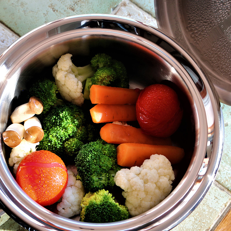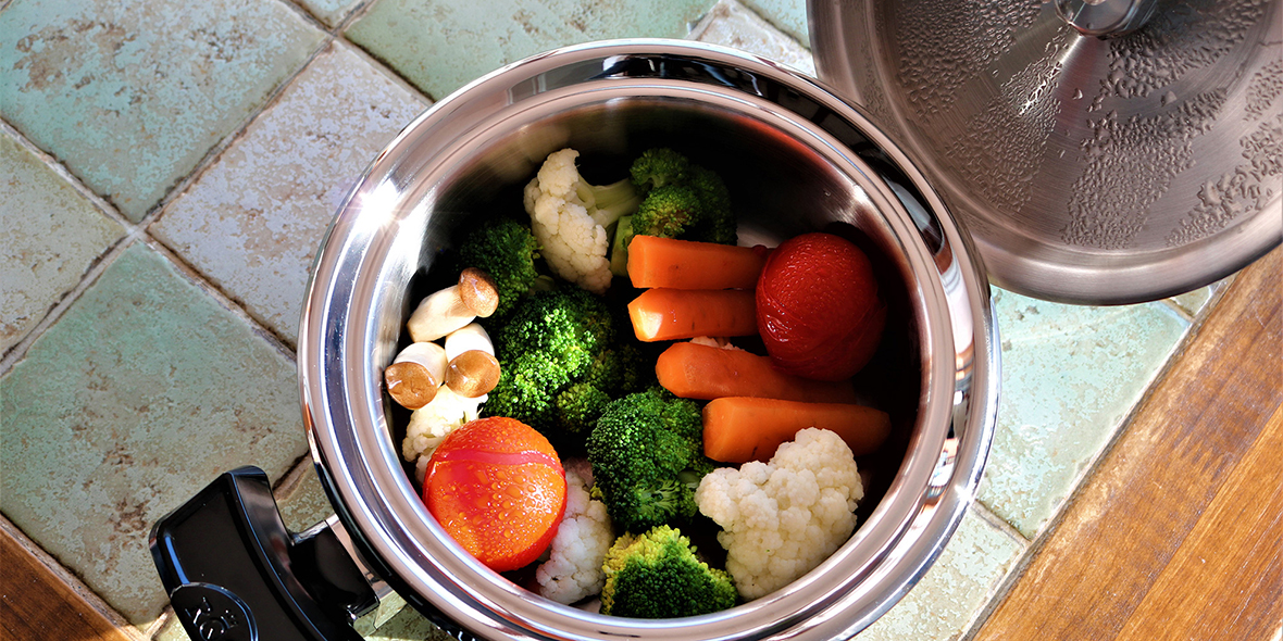 물과 기름, 버터를 넣지 않고도, 재료가 지닌 수분만을 가지고 환상적인 요리가 가능합니다.