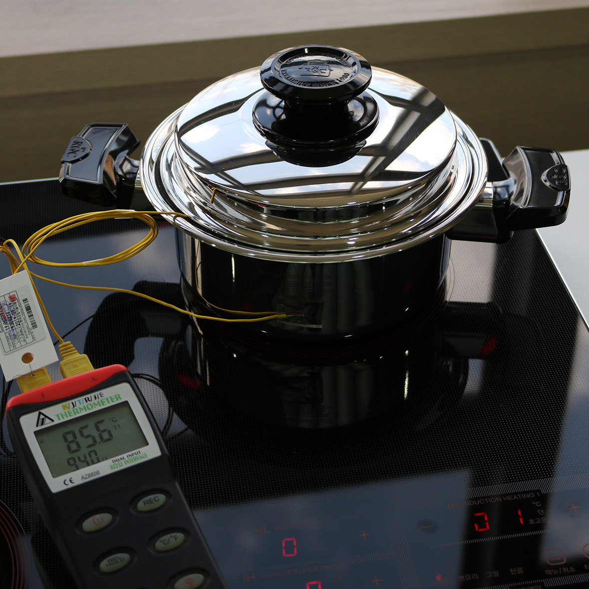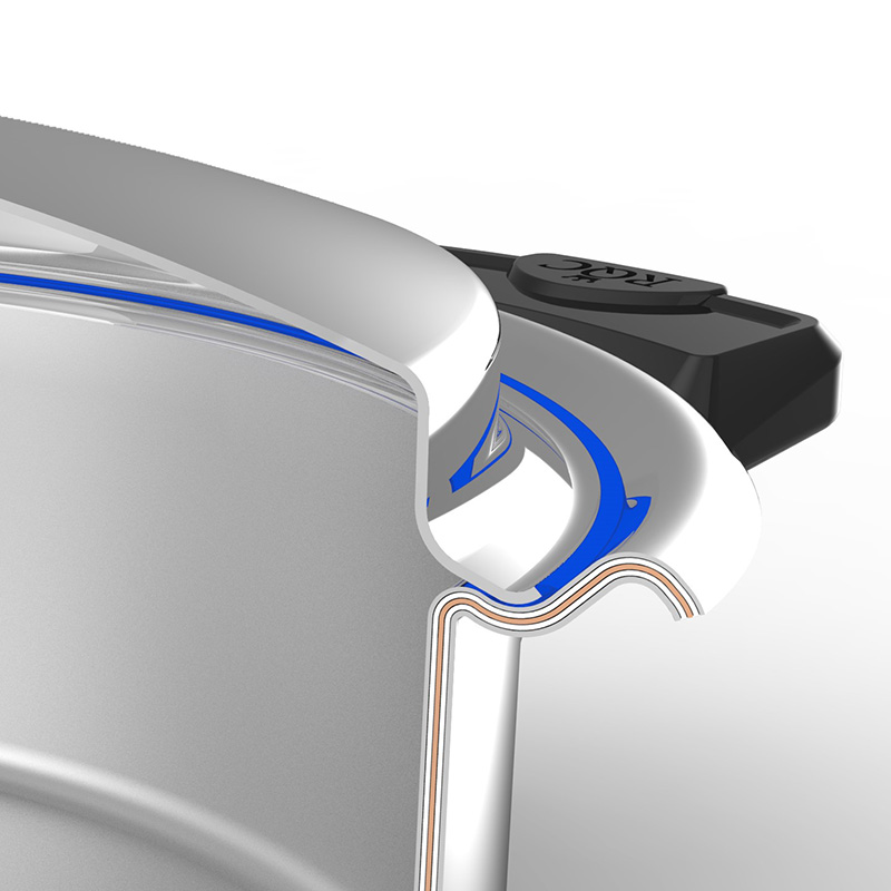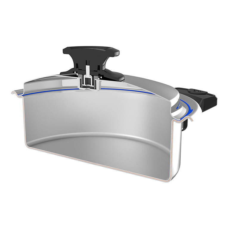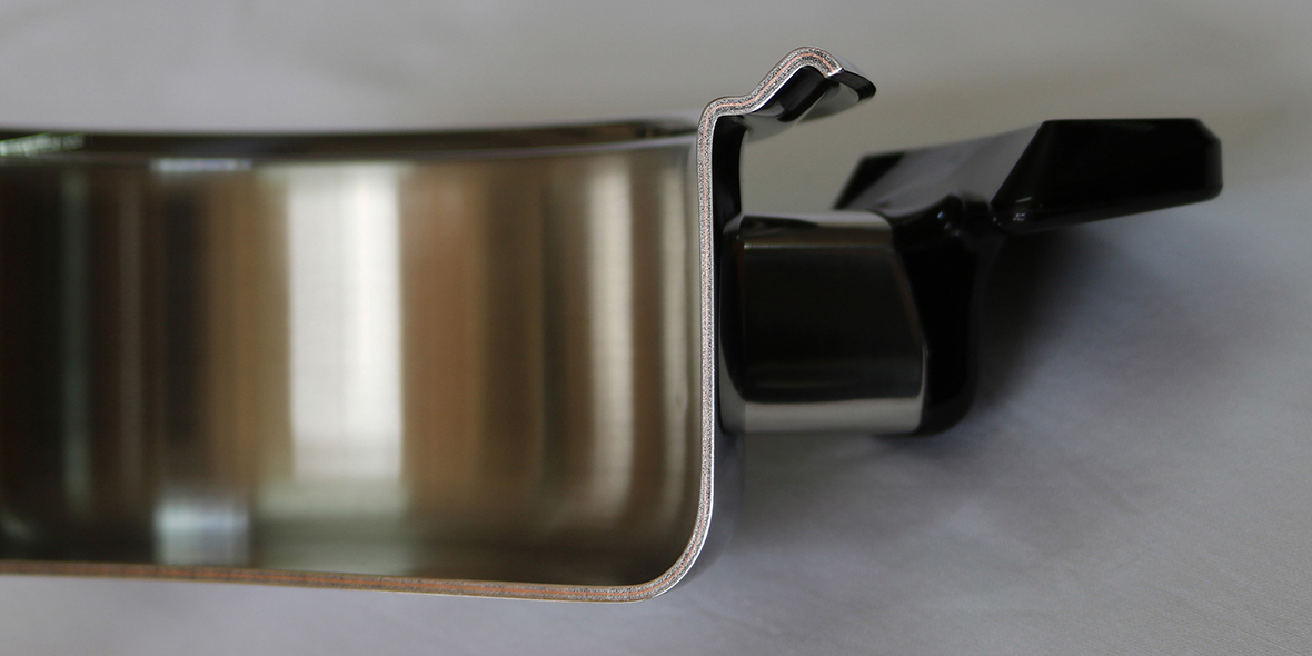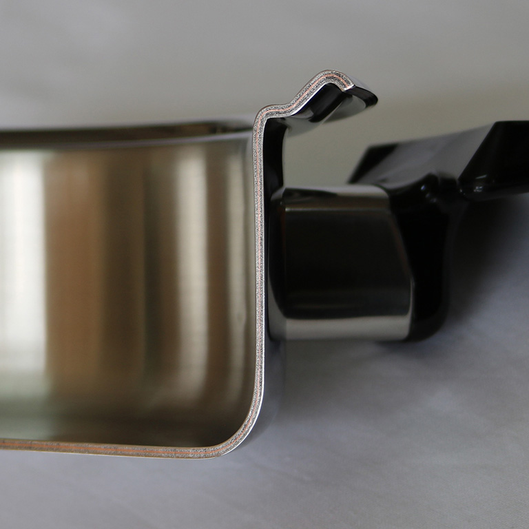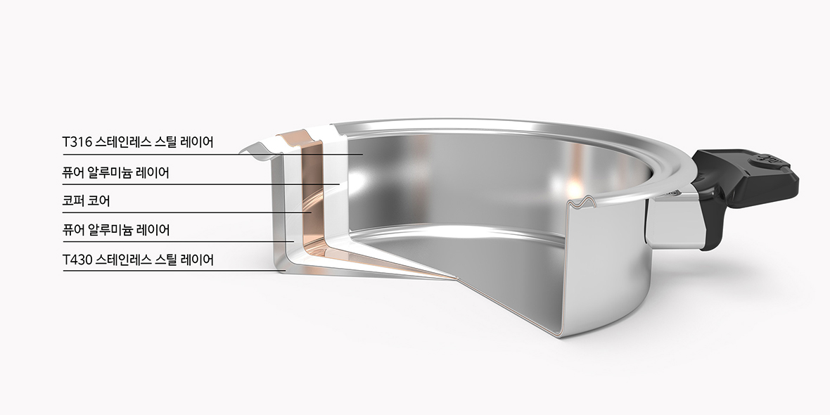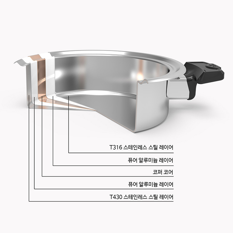 빠른 가열을 촉진하는 외부 재질(T430 스테인레스 스틸)과 안전한 조리에 가장 적합한 내부 재질(T316 스테인레스 스틸), 그 중간에 고른 열확산과 보온성이 높은 소재를 끼워 넣은 독자적인 다층구조가 열을 빠르고 균일하게 전달합니다.