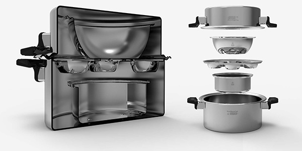 여러 개의 냄비를 포개는 스택 쿠킹(Stack Cooking)을 하면 한 개의 화구 위에서 한꺼번에 여러 요리를 효과적으로 할 수 있습니다.