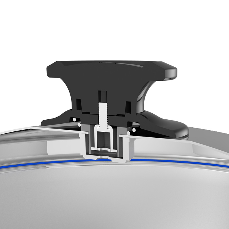 뚜껑 손잡이를 눌러 돌리면 뚜껑이 밀폐되고, 반대로 돌리면 손잡이가 위로 올라가면서 냄비내부의 수증기가 배출됩니다.